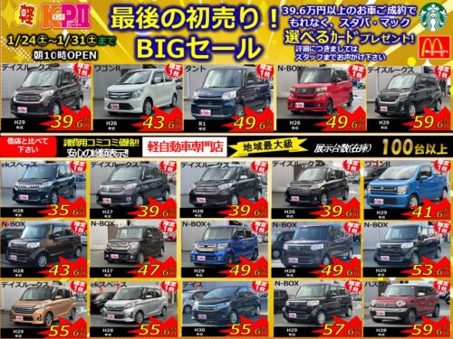 ☆初売り最後の大BIGセール☆ 2026.1.23 WEBチラシ ♪初売り最後の大BIGセールを開催♪ 2026年最後の初売りセールになります(^^)/ 今だけされにお得なお車を多数ご準備しております!! 皆様のお越しをスタッフ一同お待ちしておりますm(__)m